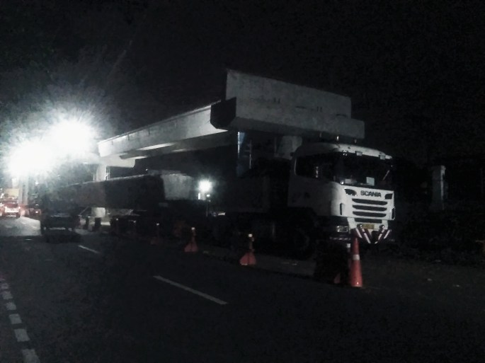 Sebuah truk panjang terparkir pada proyek jalan layang di Jaksel.