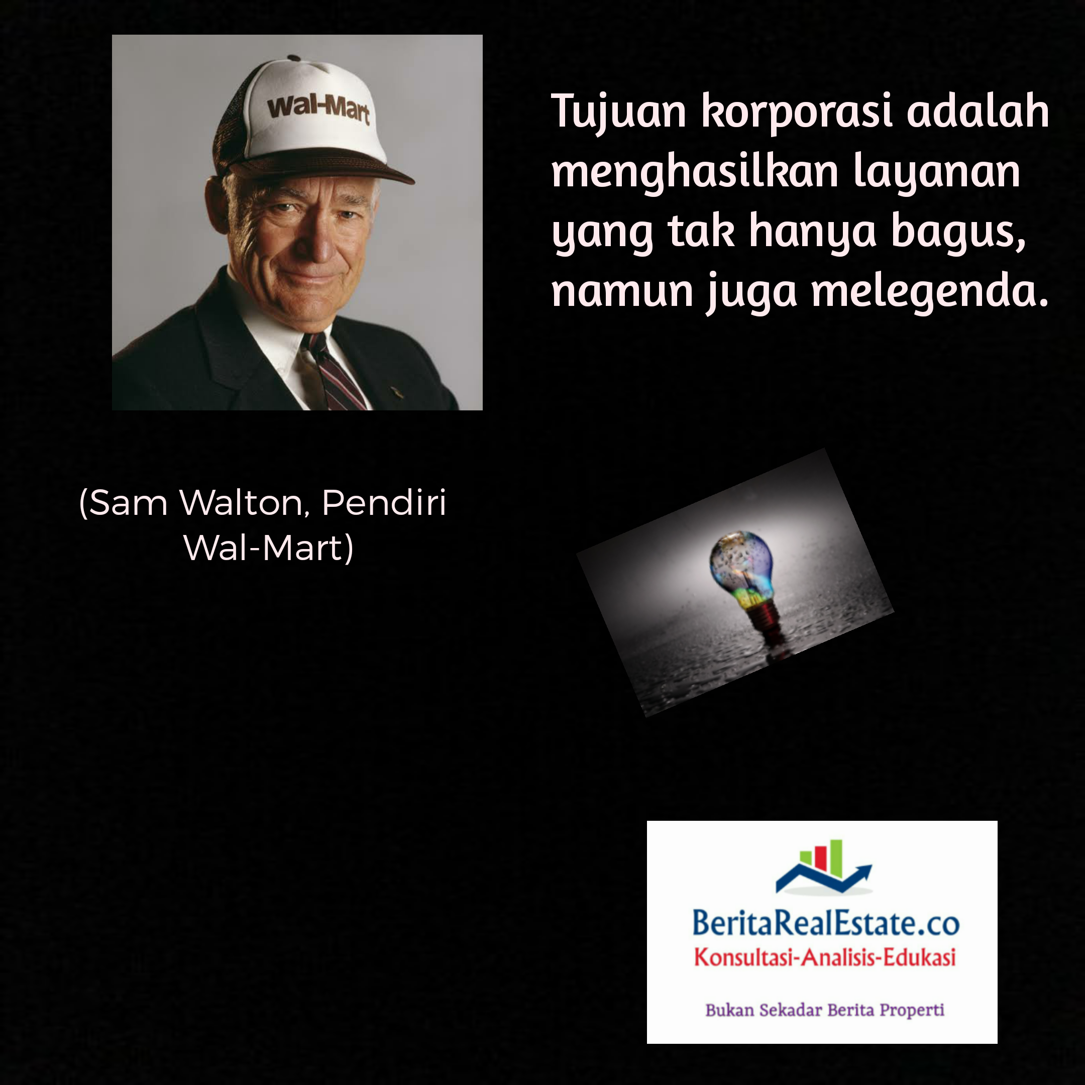 INSPIRASI SINGKAT: Sam Walton 29 Desember 202028 Desember 2020 oleh Tim Editor BRE, posted in Inspirasi Singkat Foto: Medium.com Beri peringkat:Bagikan ini: Bagikan ke X(Membuka di jendela yang baru) X Bagikan pada Facebook(Membuka di jendela yang baru) Facebook Kirim email tautan ke teman(Membuka di jendela yang baru) Surat elektronik Cetak(Membuka di jendela yang baru) Cetak Bagikan ke WhatsApp(Membuka di jendela yang baru) WhatsApp Suka Memuat... Terkait