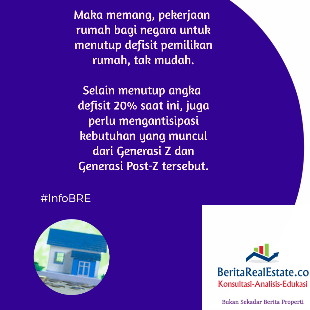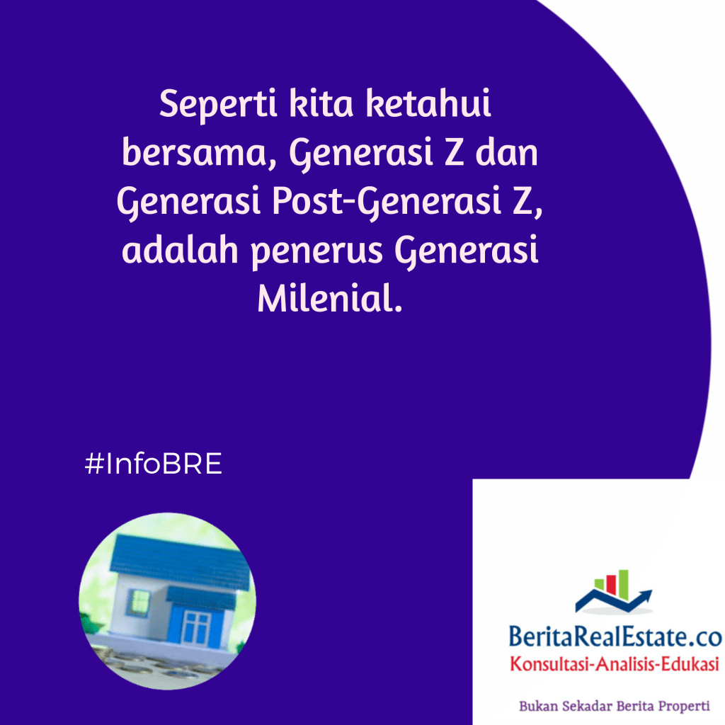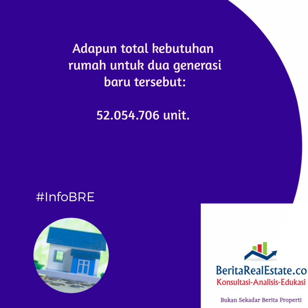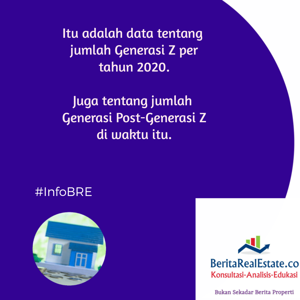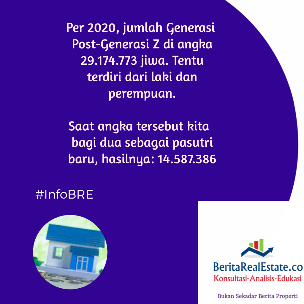 GRAFIS REAL ESTATE: Kebutuhan Unit Rumah Generasi Baru 15 Februari 202115 Februari 2021 oleh Tim Editor BRE, posted in Grafis Real Estate Indonesia kini punya generasi baru yaitu Generasi Z serta Generasi Post-Z. Jumlah generasi baru tersebut signifikan per tahun 2020, berdasar data BPS RI. Seperti apa perkiraan kebutuhan pasokan rumah untuk mereka? Mari cermati info di bawah ini. Beri peringkat:Bagikan ini: Klik untuk berbagi di X(Membuka di jendela yang baru) X Klik untuk membagikan di Facebook(Membuka di jendela yang baru) Facebook Klik untuk mengirimkan email tautan ke teman(Membuka di jendela yang baru) Surat elektronik Klik untuk mencetak(Membuka di jendela yang baru) Cetak Klik untuk berbagi di WhatsApp(Membuka di jendela yang baru) WhatsApp Suka Memuat... Terkait