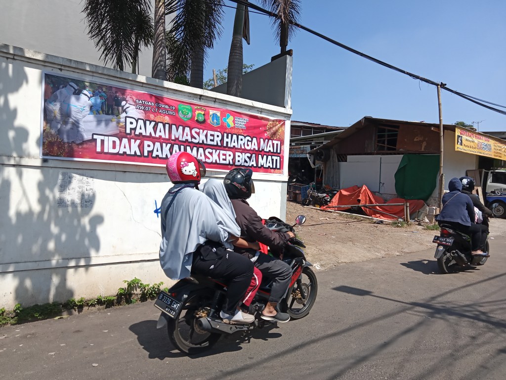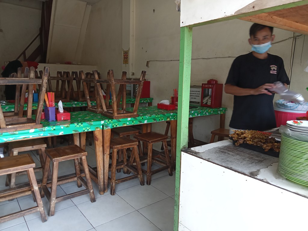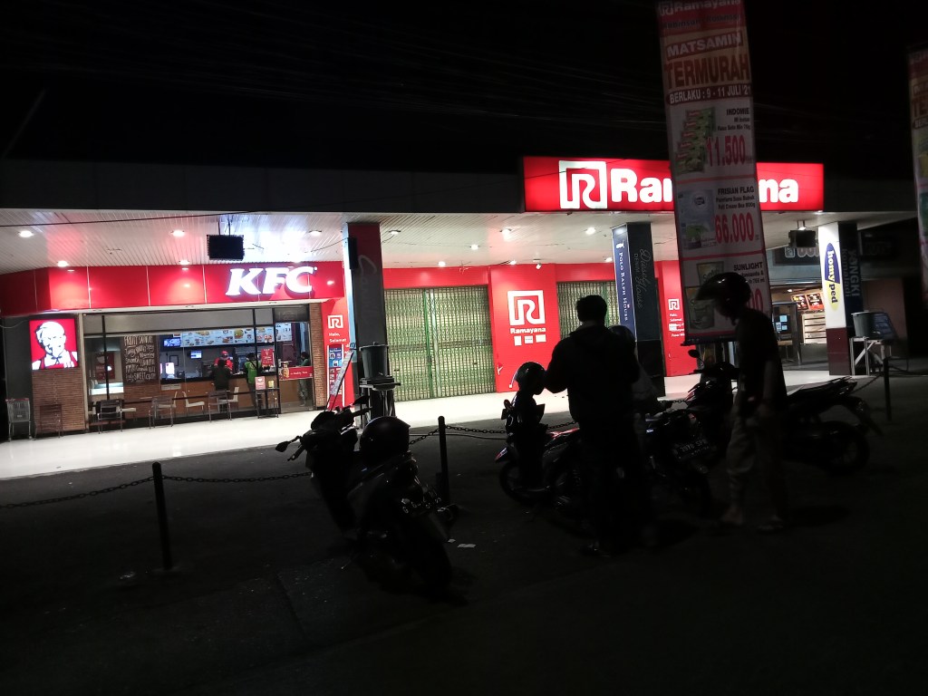 Sebuah restoran cepat saji (kiri) beroperasi tanpa membolehkan santap di tempat. Sementara sebuah department store (kanan) tutup. Foto diambil di Pasar Minggu Jaksel.Adapun dari foto di atas bisa dilihat bahwa ada dua restoran cepat saji yang buka tanpa membolehkan santap di tempat sementara itu department store di tengah foto terlihat tutup sementara.Spanduk tentang pekerja yang boleh lintas-wilayah saat PPKM Darurat, di Jaksel.Spanduk seruan menggunakan masker di Jaksel.Pedagang hewan kurban di Jagakarsa Jaksel belum terlihat ramai pembeli dan di depan lokasi itu ada banner waspada petaka Covid-19.Satu kantin di Kemang Jaksel meletakkan kursi-kursi di atas meja. Pembeli tak boleh makan di tempat.